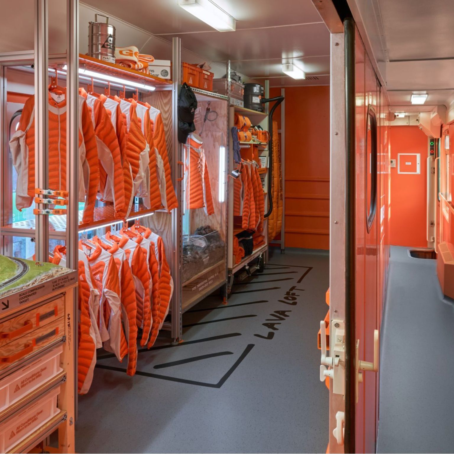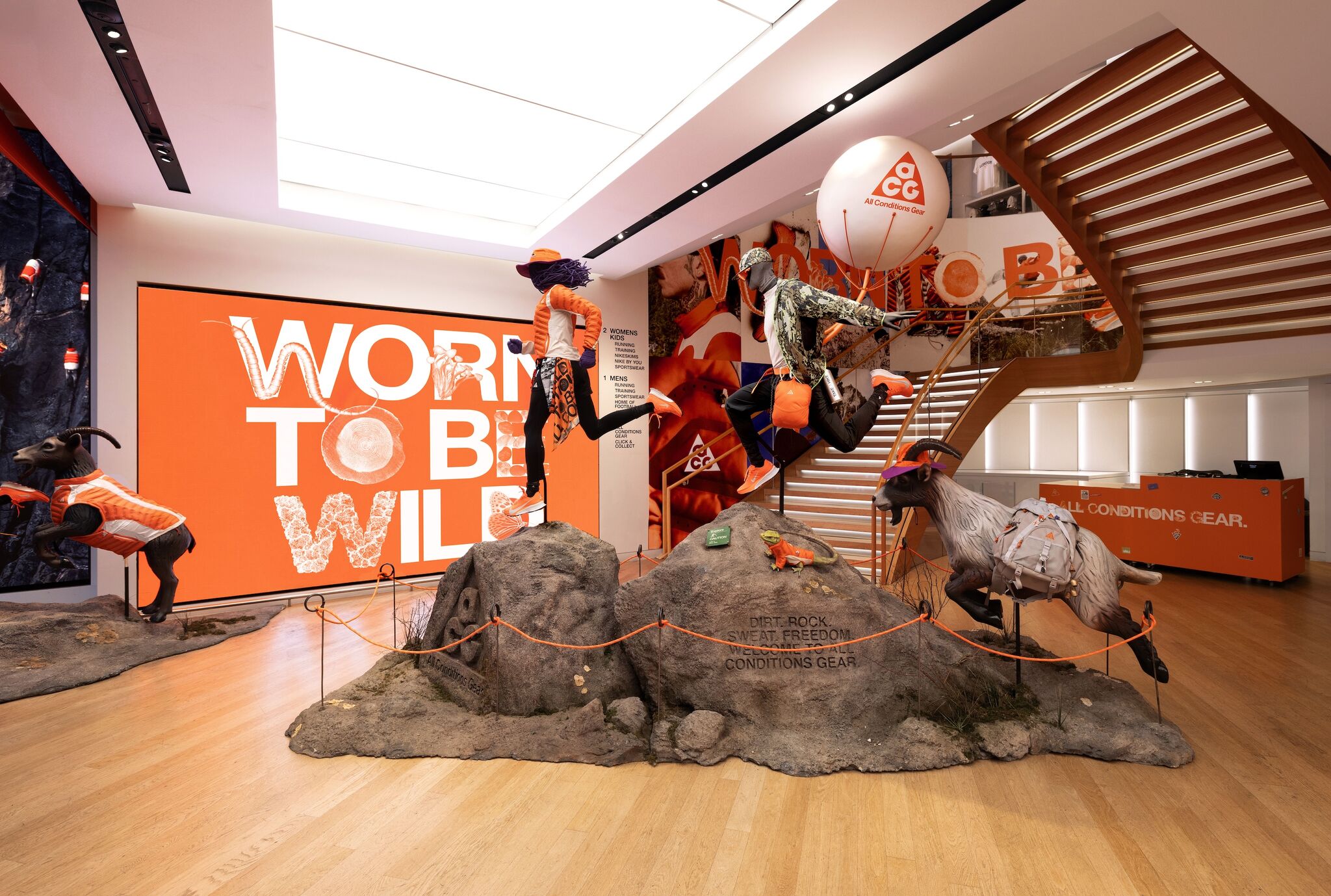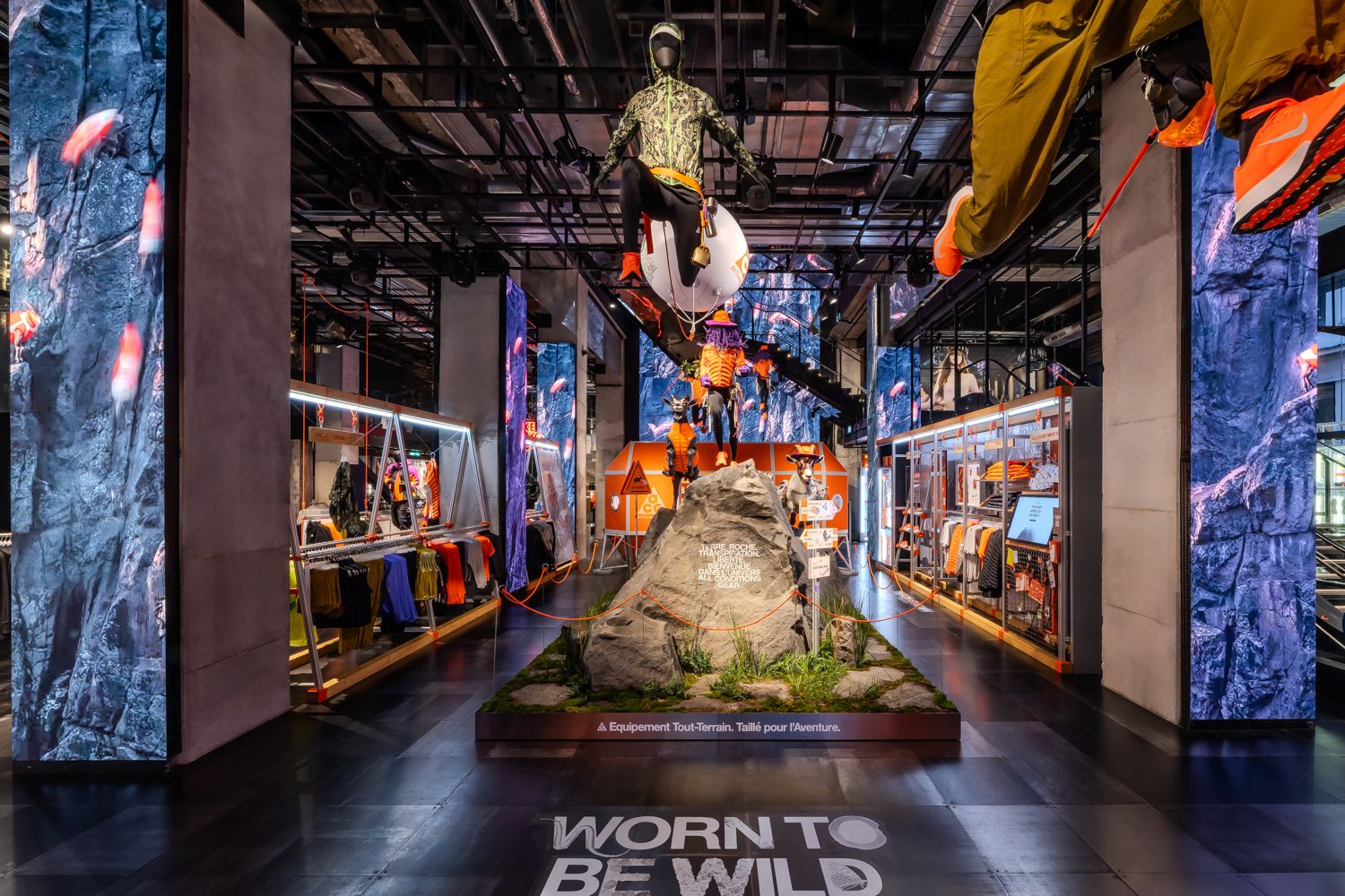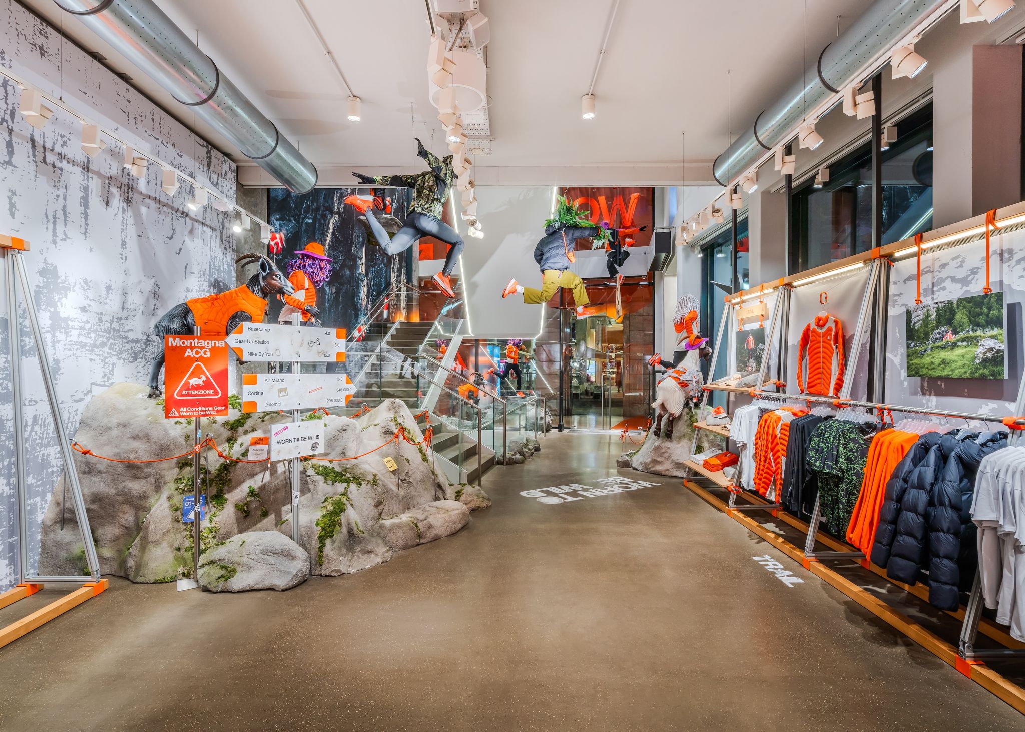 The interiors of stores in Paris, Milan, London or New York feature rock shapes that evoke mountains, mannequins in positions and levels that reflect outdoor sports, natural details or even animal sculptures, such as bears and goats. All of this is combined with the brand’s corporate orange and environments that emulate the interior of tents or high-tech shelters.