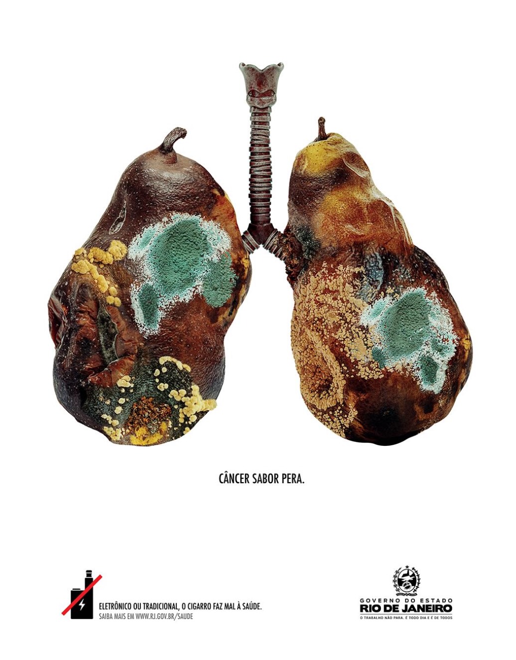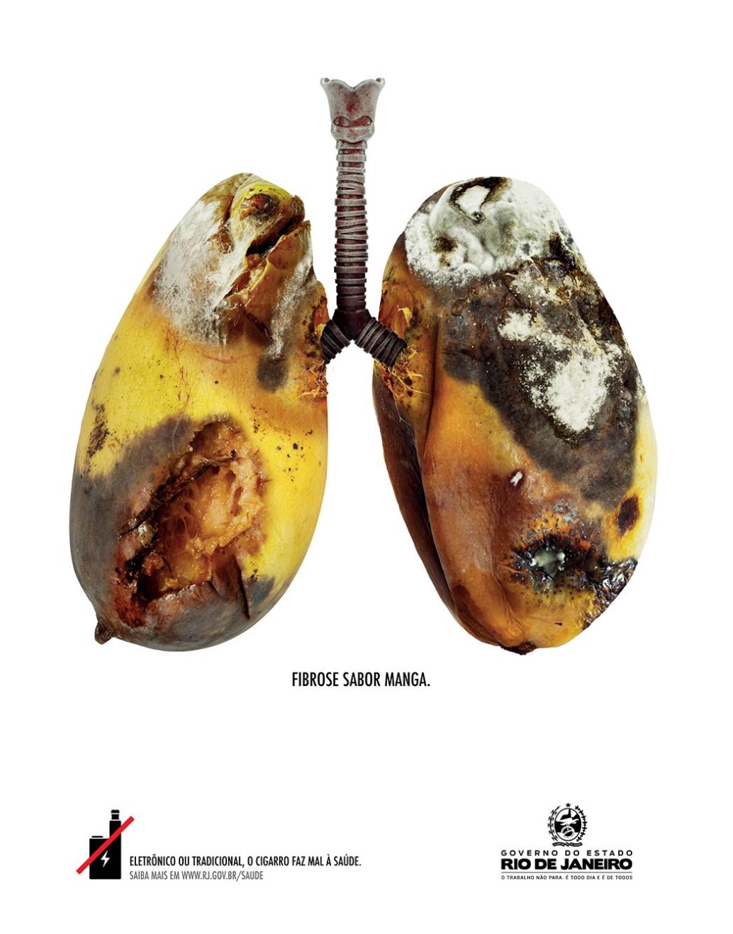 In addition, each graph refers to possible diseases derived from smoking. The pieces include the phrases “Strawberry flavor emphysema”, “Mango flavor fibrosis” or “Pear flavor cancer.” They are accompanied by the claim “Electronic or traditional, cigarettes harm your health”, and a link to the health section of the Government of the State of Rio de Janeiro for more information.