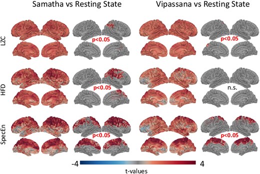 In both Samatha and Vipassana, more richness and dynamism is observed in the brain signal. In the case of Samatha, this effect is even more consistent in some regions of the brain.