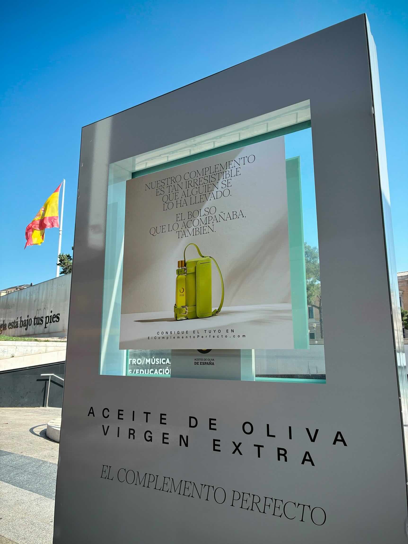 As part of another phase of the campaign, Aceites de Oliva de España exhibited the bag on special supports (empty mupis as a display case) to bring the public closer to the exclusive fashion piece. However, he staged the robbery of those located in the Plaza de Colón and the Plaza de la Cebada, both in the capital, and replaced the accessories with graphics with the message “Our accessory is so irresistible that someone has taken it. The bag that accompanied it too.”